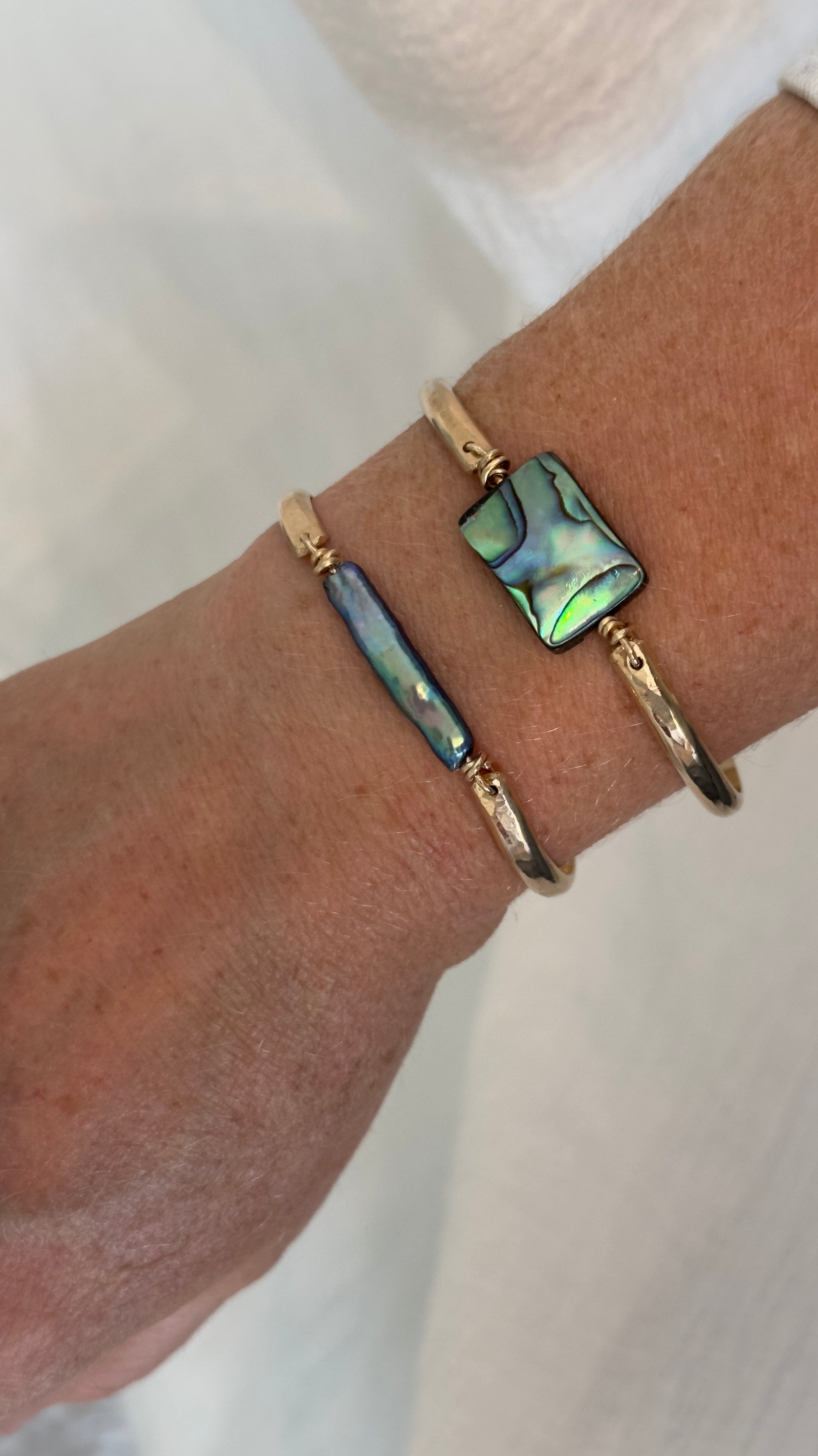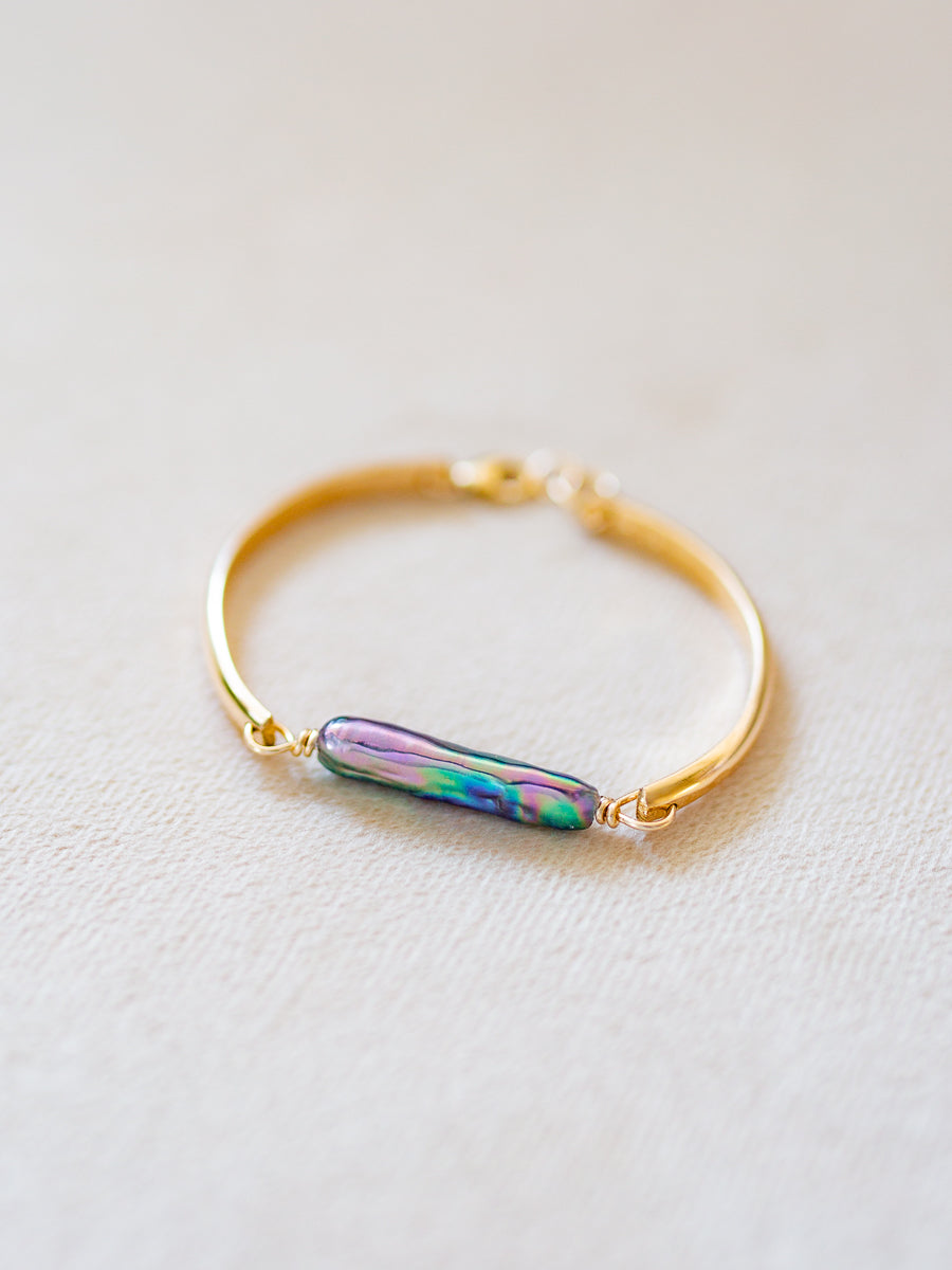 The Azura bracelet features a gorgeous matchstick pearl strung in-line with a luxuriously thick 14k gold-fill band. The rainbow iridescence of the peacock pearl is unreal, and hard to come by. We hand selected each pearl for this very limited collection. Also available in an elegant satiny white pearl, both part of the Azura collection.