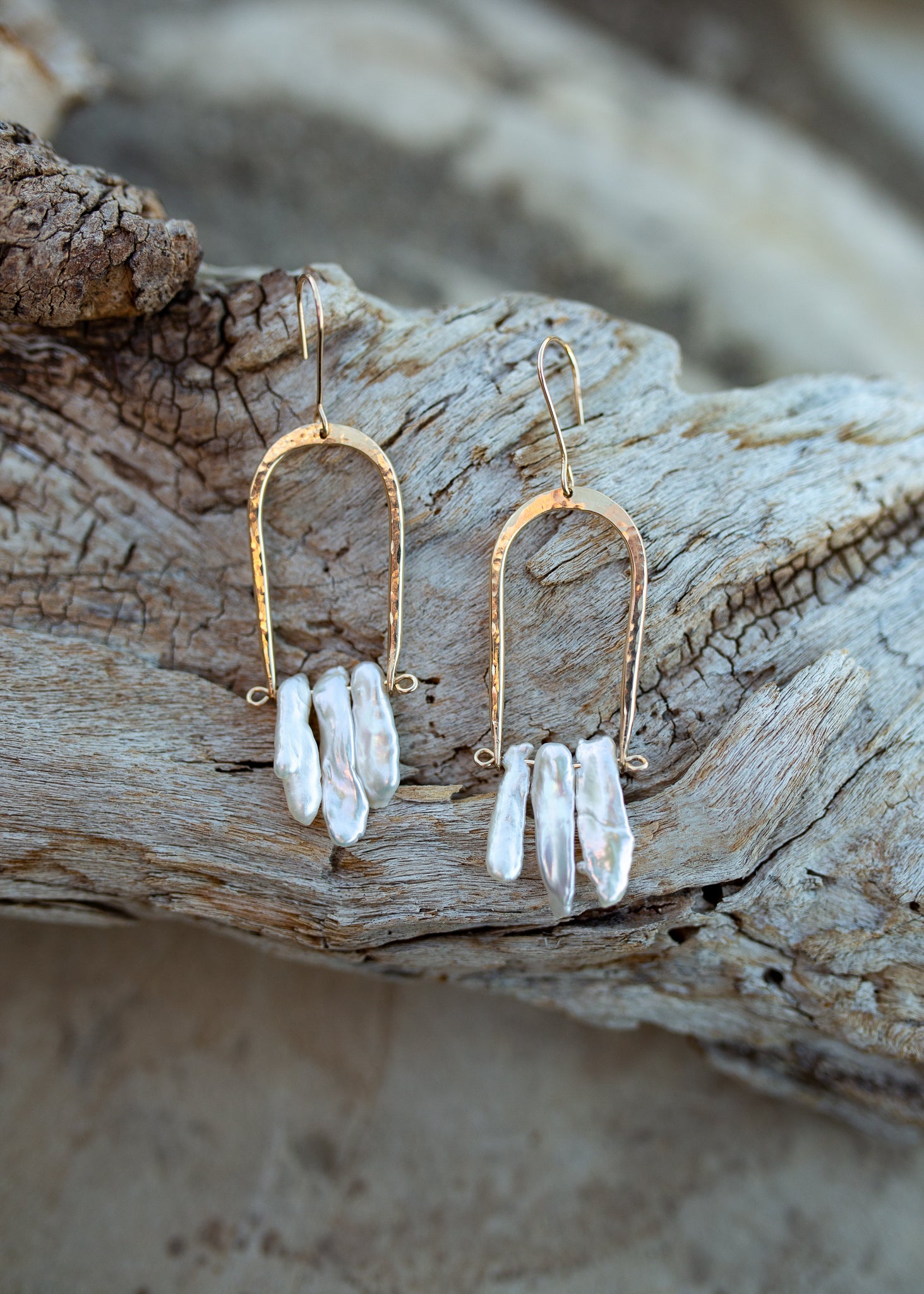 The Nerissa earrings feature three organically shaped biwa pearls strung on thick 14k gold fill arches. We love this modern shape paired with the organic textures and tones of the pearls and gold.