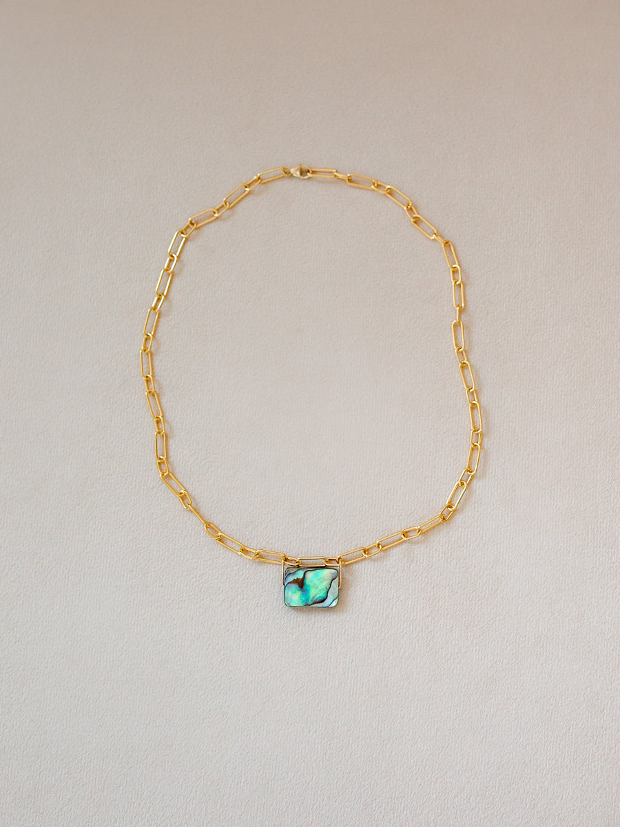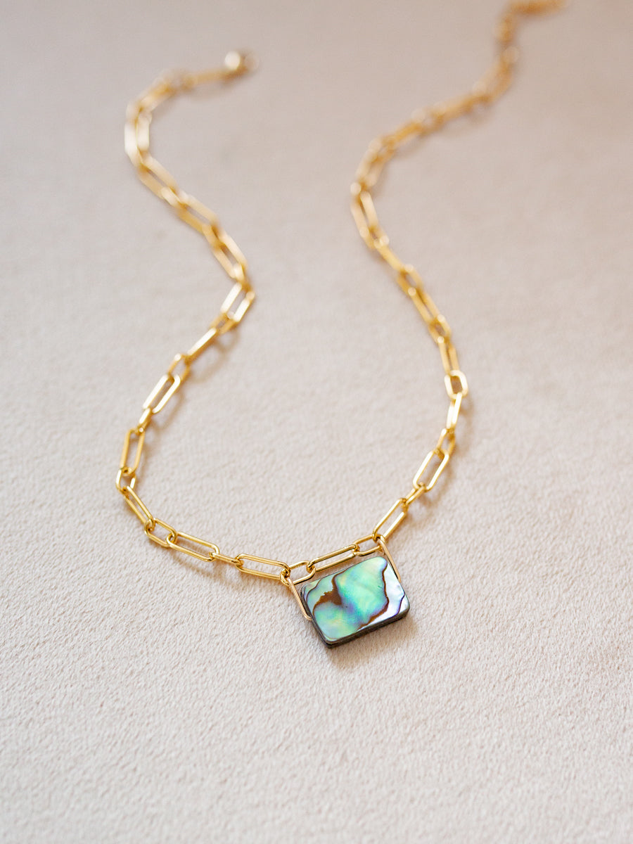 Make a statement with this mesmerizing abalone necklace. Featuring a wildly beautiful vintage abalone pendant set with a unique hand forged bail onto a thick slinky 14k gold paperclip chain. The colors of this two-sided pendant are practically holographic! Whether you're keeping it cool in jeans and a clean white tee, or slipping into your finest evening dress, the Fauna necklace transitions effortlessly from day to night, making it the versatile luxury piece of your dreams. With ethically sourced abalone and gold, you can feel as good as you look.